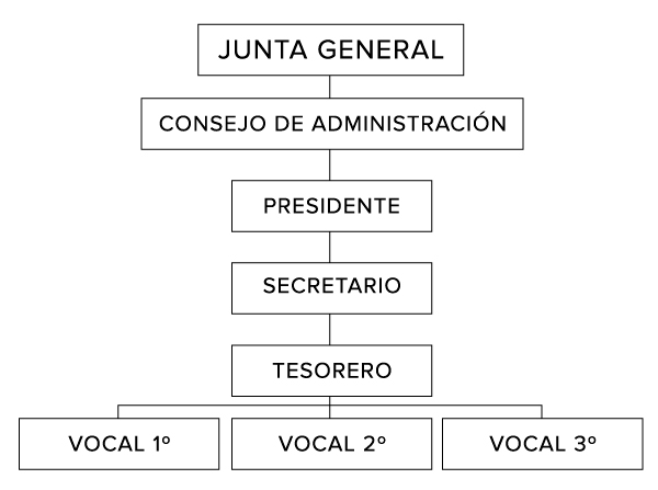 El Consejo de Administración está constituido por su Presidente, un Secretario, un Tesorero y tres Vocales, que se titularán Vocal 1º, Vocal 2º y Vocal 3º.